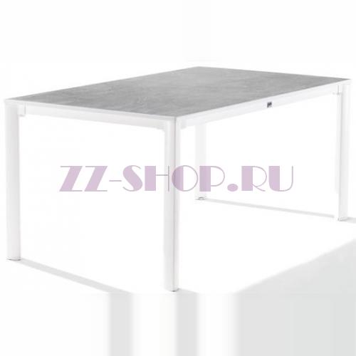 Большой удобный стол со стальным каркасом белого цвета и серой износостойкой столешницей.