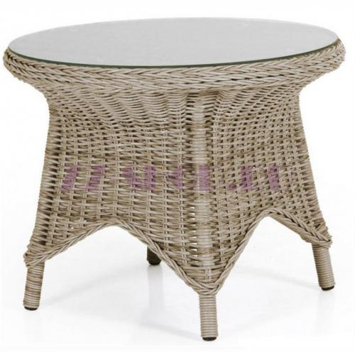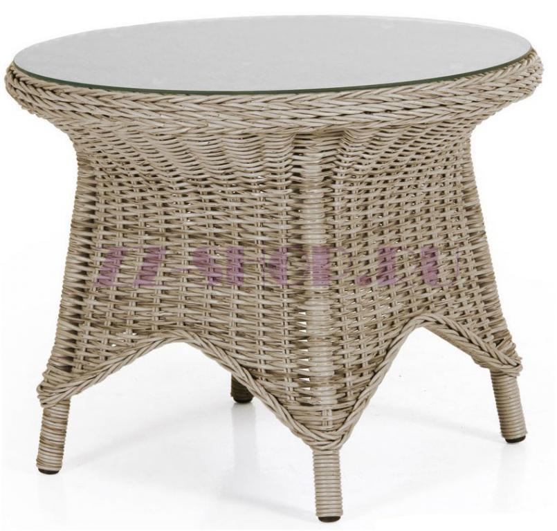 Маленький приставной круглый столик 5634-7, выполненный из искусственного ротанга бежевого цвета с патиной на алюминиевом каркасе.
