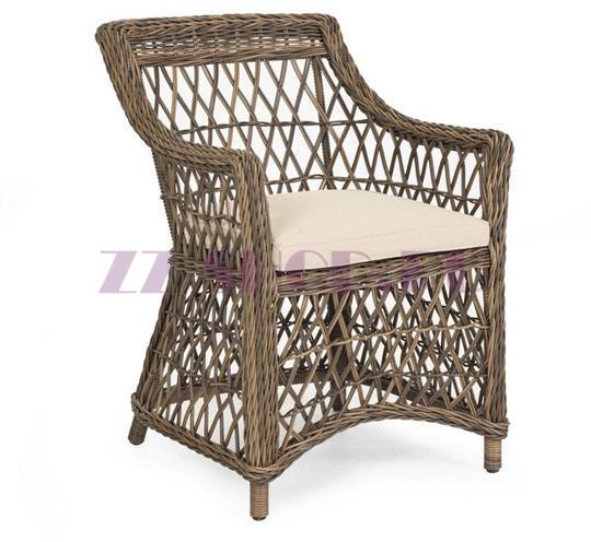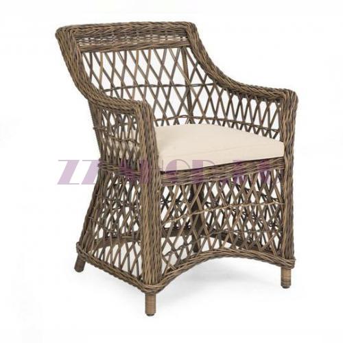 Кресло 5691-60-20 с подлокотниками из коллекции Beatrice выполнено из искусственного ротанга коричневого цвета, в комплекте с креслами идет подушки бежевого цвета.