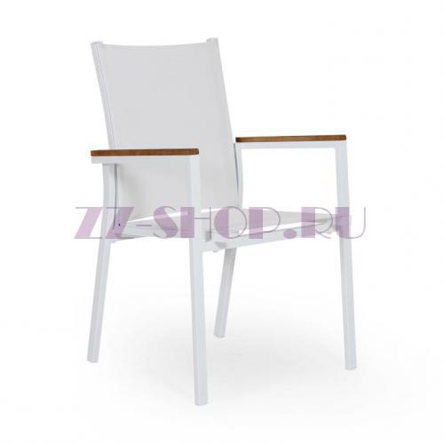 Avanti - штабелированный стул.Выполнен из лакированного алюминия с подлокотниками из тика, со спинкой и сиденьем текстилайн.
