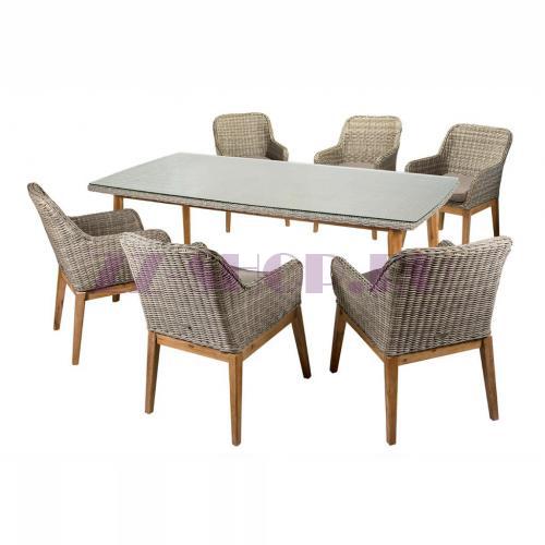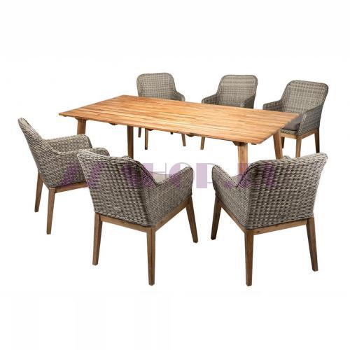 Сочетание искусственного ротанга серого цвета и натуральной древесины акации выглядит очень уютно и стильно.