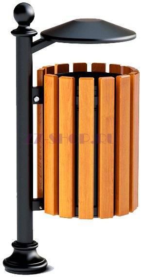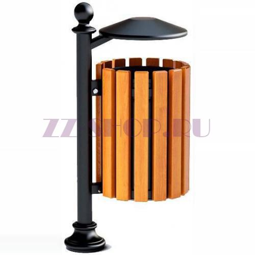Парковая урна на столбике с деревянной отделкой, оборудованная съемным ведром и крышкой, защищающей от дождя. Данная модель популярна при обустройстве больших классических парков в сочетании со скамейками на чугунном основании.