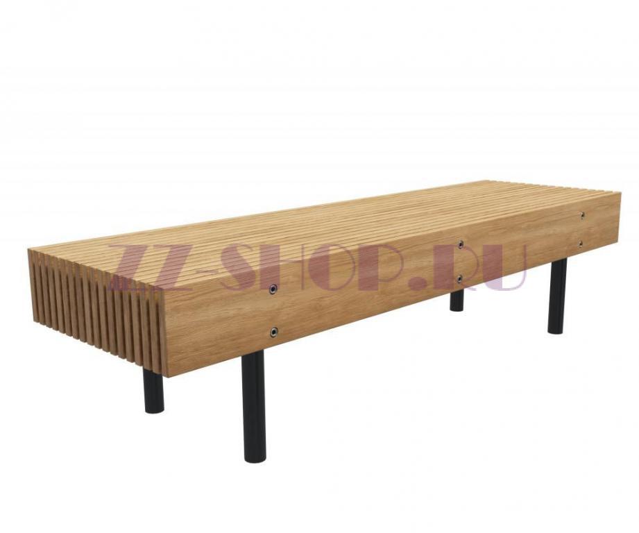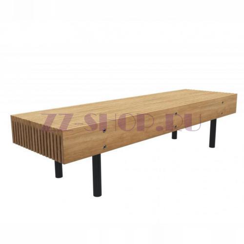 Скамейка «Линия» без спинки имеет необычную конструкцию: ламели размещаются боком. Благодаря этому, простая по форме скамья сразу привлекает внимание. Плюс конструкции в том, что во время дождя вода не скапливается на поверхности сиденья, а значит древесина меньше пострадает от воздействия влаги и прослужит дольше.
