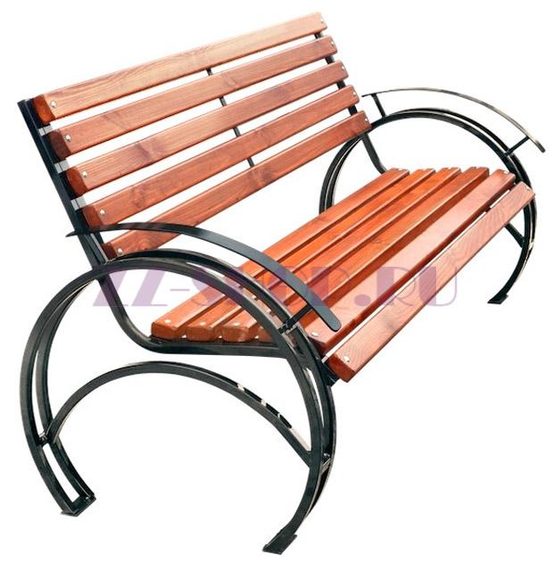 Современная скамейка, выполнена из дерева и стали, в дизайне которой преобладают плавные линии.
