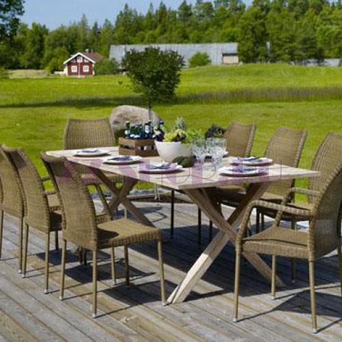 Он одинаково хорошо будет смотреться и с тиковыми, и с плетеными креслами.