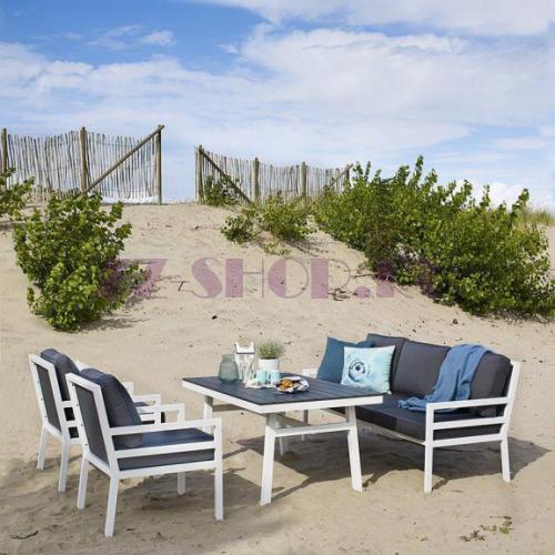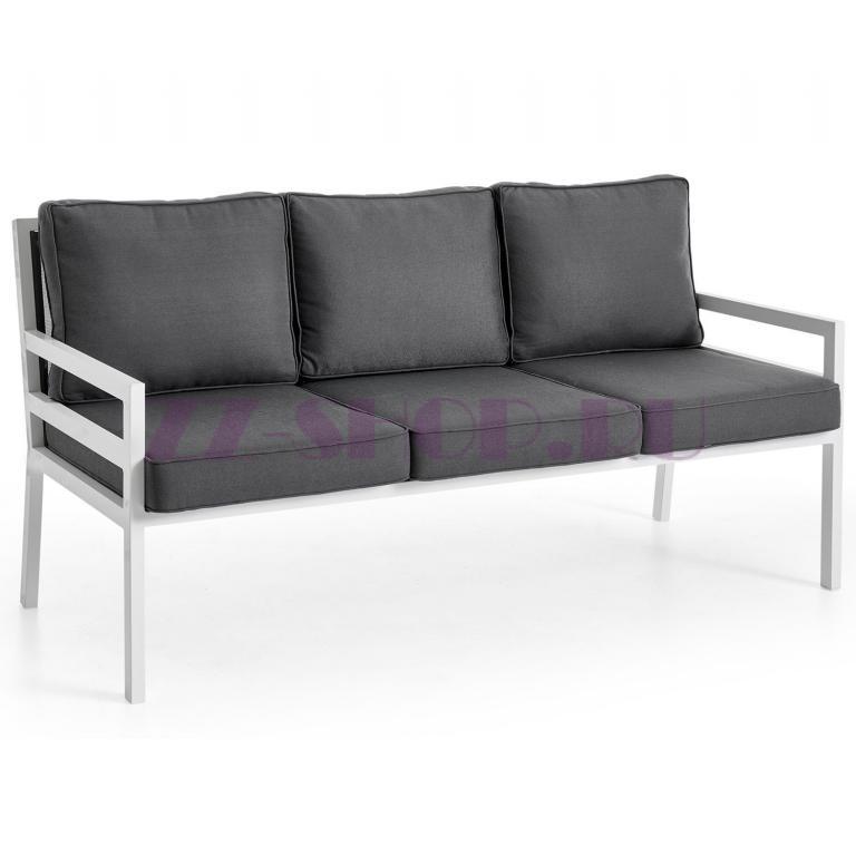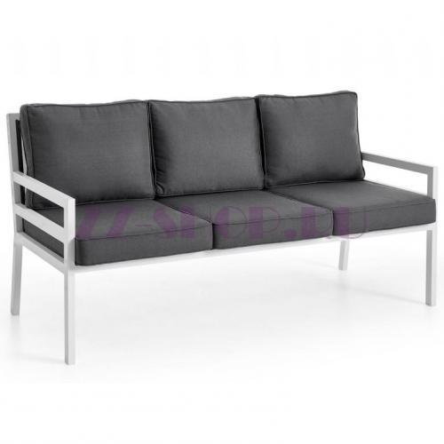 Трехместный Диван Bergerac изготовлен из белого алюминия в сочетании с тканым материалом текстилен.Подушки серого цвета в комплекте.