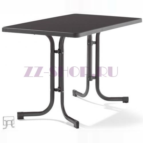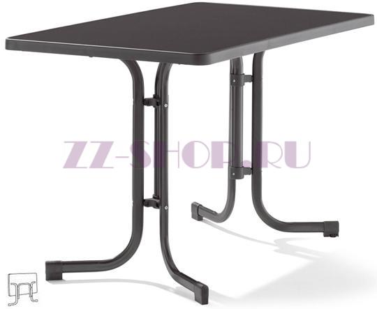 Прямоугольный стол Mecalit с основанием из нержавеющей стали и столешницей с долговечным покрытием, которое не боится ни осадков, ни солнечных лучей.