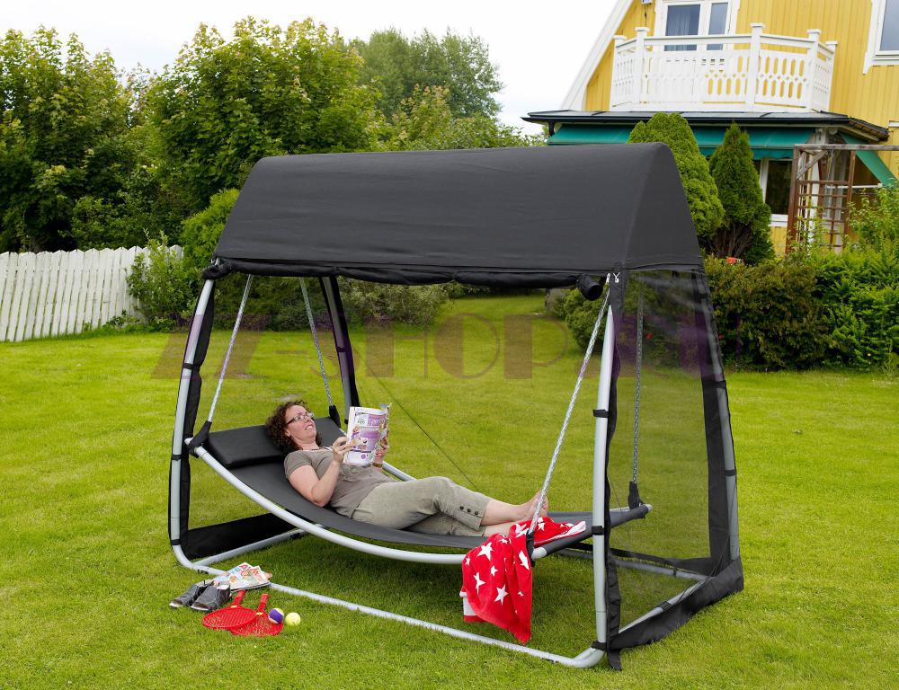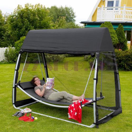 У качели имеется крыша и москитные сетки со всех четырех сторон.