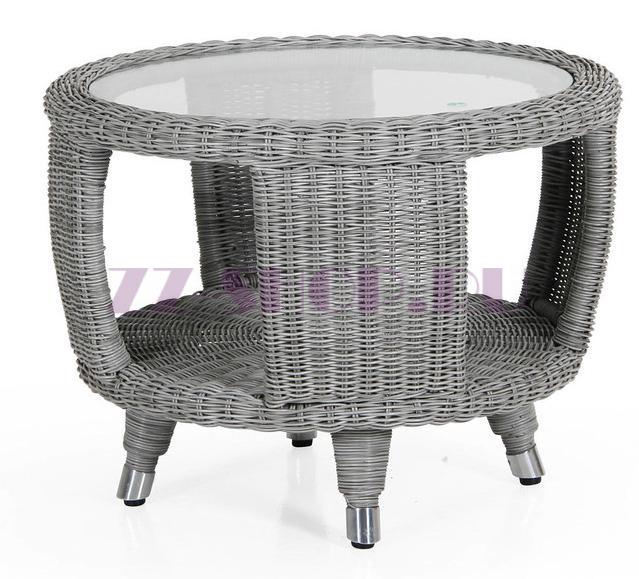 Низкий двухярусный круглый кофейный столик. Он выполнен из искусственного ротанга серого цвета на алюминиевом каркасе.