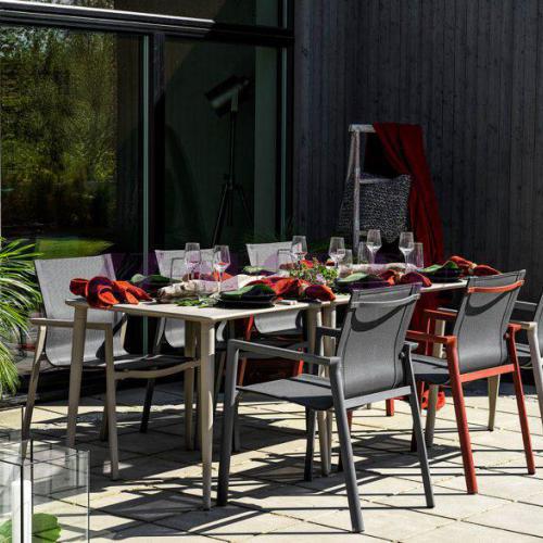 Delia - практичное штабелируемое кресло, выполненное из матового лакированного алюминия красного цвета с черным текстиленом.- brafab