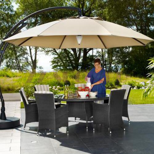 Оно выполнено из плоского 7-мм искусственного ротанга черного цвета на алюминиевом каркасе.