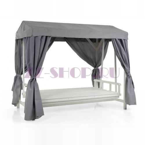 Качели изготовлены из FSC-сертифицированной сосны, окрашенной в белый цвет, вся фурнитура гальванизирована. А крыша из водонепроницаемого ПВХ и стенки на липучках защитят вас от дождя и ветра.